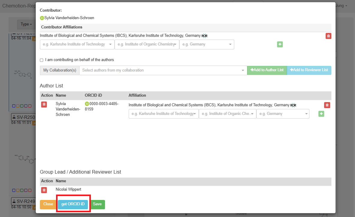 The ORCID iD is automatically assigned when the submitter submits the submission, retrieved from the collaborator's account. If the ORCID iD is updated in the collaborator's account, you can click Get ORCID iD to reload the updated information.